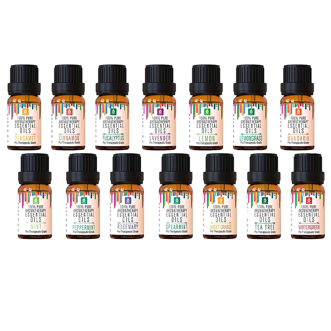 - SET INCLUDES THE FOLLOWING SCENTS: Bergamot, Lemon, Peppermint, Tea Tree, Cinnamon, Lemongrass, Rosemary, Wintergreen, Eucalyptus, Mandarin, Spearmint, Lavender, Mint, Sweet Orange.