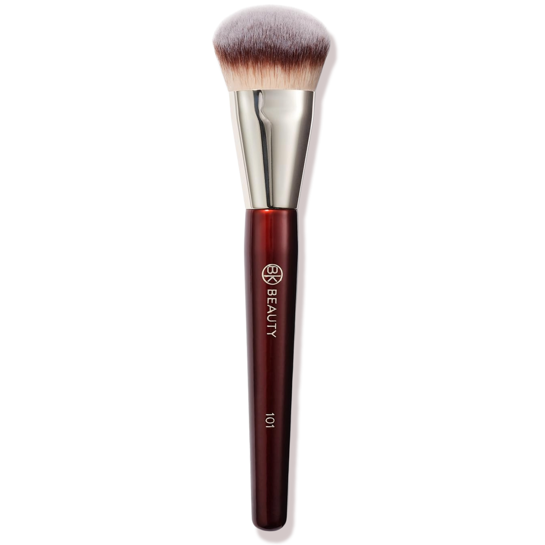 Contoured foundation brush that blends liquid and cream formulas streak-free for natural, flawless coverage.