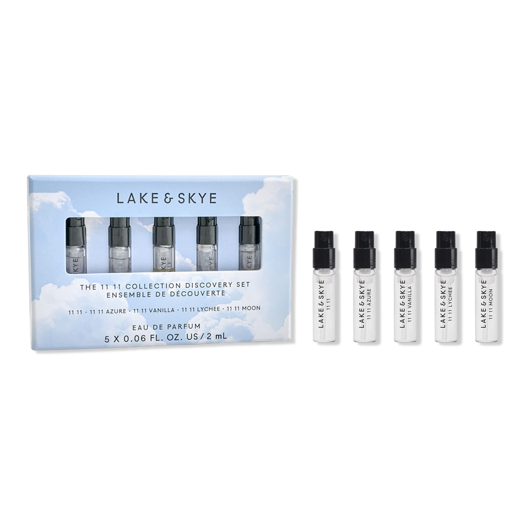 Lake & Skye's signature 11 11 Skin Scents in a travel-sized set featuring five 2ML spray sample vials of 11 11, 11 11 Azure, 11 11 Vanilla, 11 11 Lychee, and 11 11 Moon.