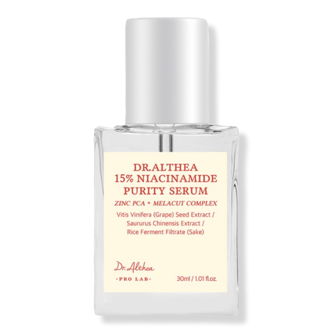 Dr. Althea 15% Niacinamide Purity Serum contains a high concentration of 15% Niacinamide to effectively brighten the skin, refine pores, and improve overall skin tone and texture.