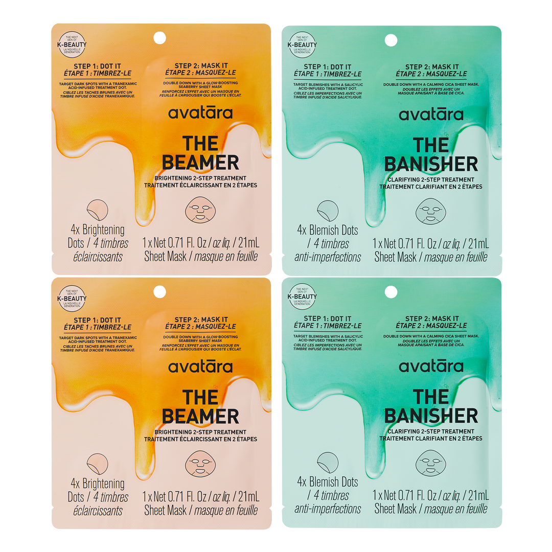 The Banisher Dot: Centella Asiatica Extract, Butylene Glycol, Glycerin, Pullulan, Water/Aqua/Eau, Salicylic Acid, Melaleuca Alternifolia (Tea Tree) Leaf Oil The Banisher Mask: Water/Aqua/Eau, Glycerin, Propanediol, 1,2-Hexanediol, Arginine, Salicylic Acid, Lactic Acid, Gluconolactone, Lactobacillus Ferment Lysate, Betaine, Sodium Hyaluronate, Sodium Phytate, Centella Asiatica Extract, Taraxacum Officinale (Dandelion) Leaf Extract, Inula Britannica Flower Extract, Pinus Palustris Leaf Extract, Pueraria Lobata Root Extract, Ulmus Davidiana Root Extract, Oenothera Biennis (Evening Primrose) Flower Extract, Aloe Barbadensis Leaf Juice, Cichorium Intybus (Chicory) Leaf Extract, Trehalose, Xanthan Gum, Dehydroxanthan Gum, Ethylhexylglycerin, Butylene Glycol The Beamer Dot: Centella Asiatica Extract, Butylene Glycol, Glycerin, Pullulan, Water/Aqua/Eau, Tranexamic Acid, Niacinamide The Beamer Mask: Water/Aqua/Eau, Glycerin, Propanediol, 1,2-Hexanediol, Niacinamide, Hippophae Rhamnoides Water, Trehalose, Tranexamic Acid, Madecassoside, Glutathione, Sodium Phytate, Betaine, Sodium Hyaluronate, Agave Tequilana Leaf Extract, Aloe Barbadensis Leaf Juice, Dehydroxanthan Gum, Ethylhexylglycerin, Caprylyl Glycol, Decyl Glucoside, Butylene Glycol, Pentylene Glycol