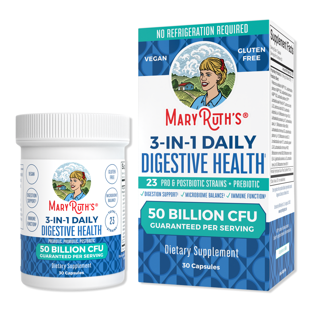 MaryRuth's 3 in 1 Daily Digestive Health Probiotic 50 Bil CFU is a Pre, Pro, and Postbiotic formulated with strains for digestive health. Help relieve occasional diarrhea and support microbiome balance with one convenient capsule per day!