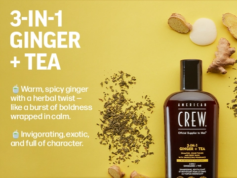 Energize and wash with American Crew 3-in-1 Ginger + Tea Shampoo, Conditioner and Body Wash.