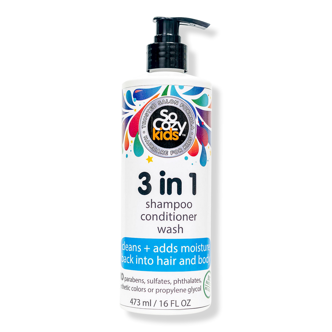 SoCozy 3 in 1 Shampoo + Conditioner + Body Wash for Kids is a Salon formula for Kids that gently cleanses, conditions hair and skin.