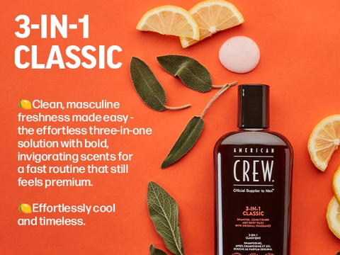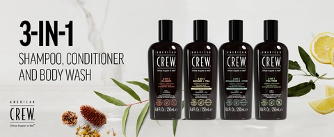 American Crew 3-In-1 Shampoo, Conditioner and Body Wash for men cleanses and conditions hair and skin.