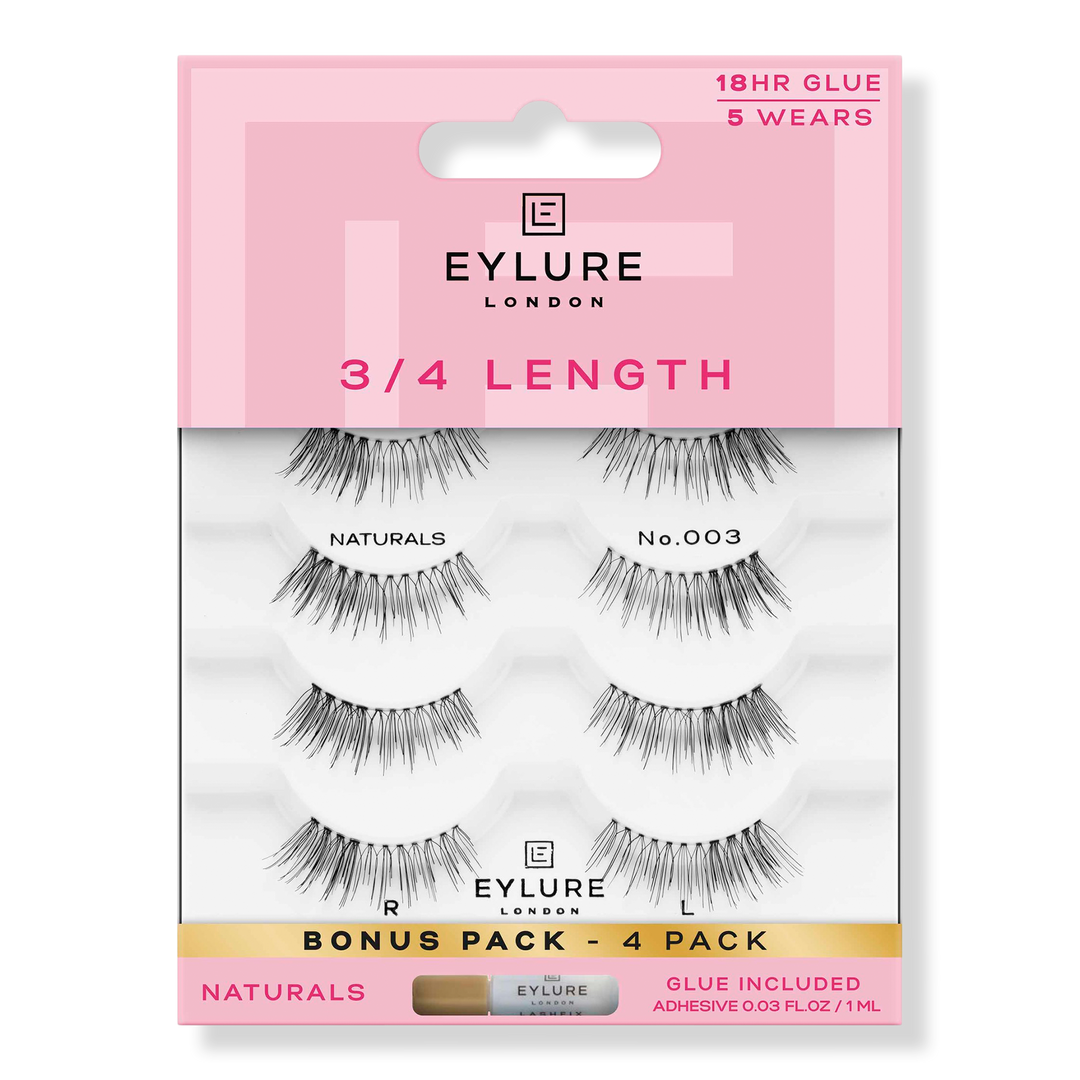 Eylure 3/4 Length Naturals No. 003 Eyelashes Multipack are here to give you the lightweight and adorable look you crave with Âľ length lashes perfect for professionals and beginners. Now available in a multipack, with a bonus lash and latex-free 18 hour hold lash glue included.