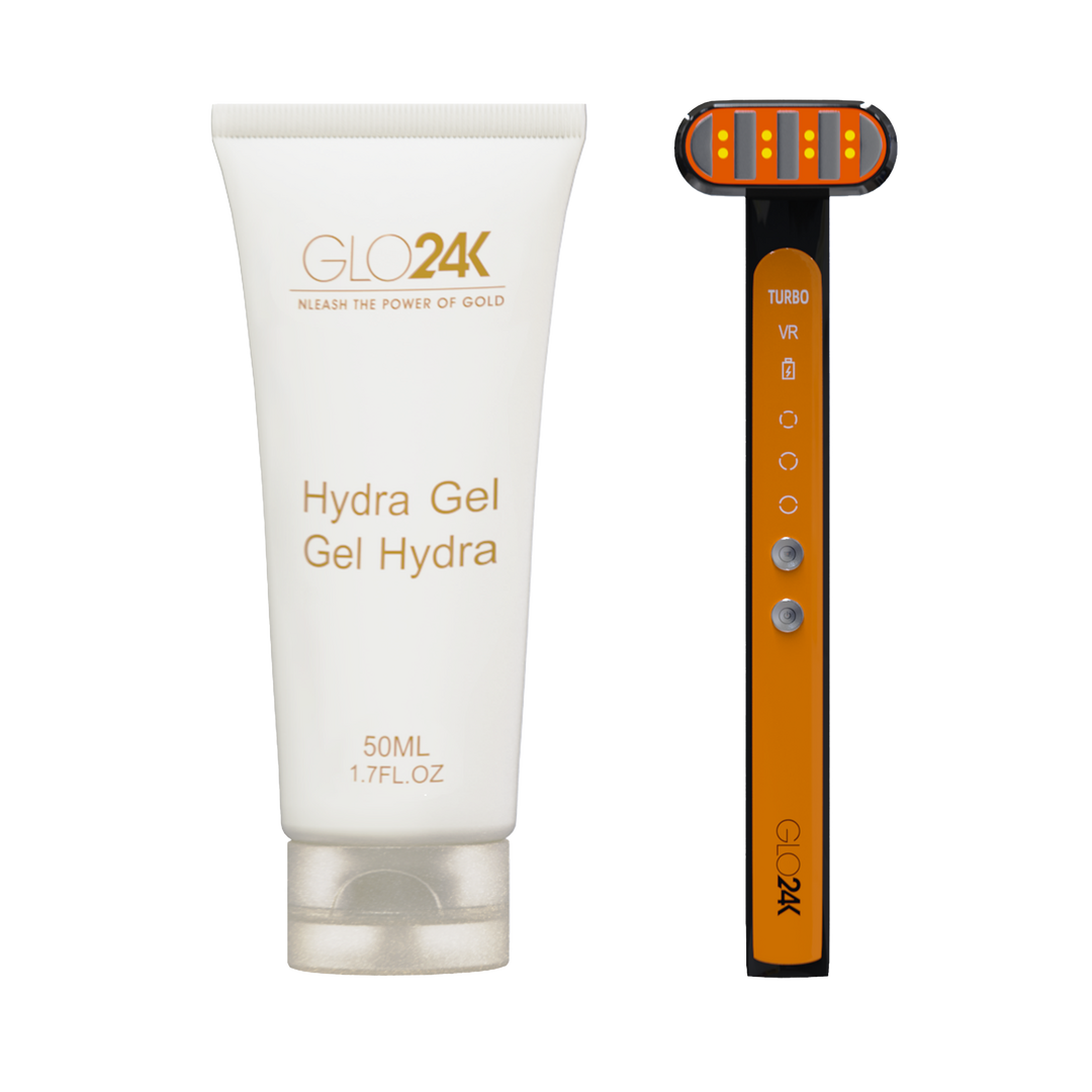 - GLO24K Super Wand is loaded with advanced technologies such as 7 Color LED, Controlled Gentle Heating, and Vibration, to name a few. The Super Wand also has a unique 360 degrees rotating massage head for a better targeted application. It also has a Turbo button for enhanced performance. The Super Wand is paired with an activating conductive and refreshing Hydra Gel for maximum efficacy. GLO24K Super Wand is designed to target the delicate skin of the face, neck, and around the eyes, battling wrinkles, fine-lines, and sagging skin for a glowing complexion. Use as needed, 5-10 minutes at a time. For all skin types.