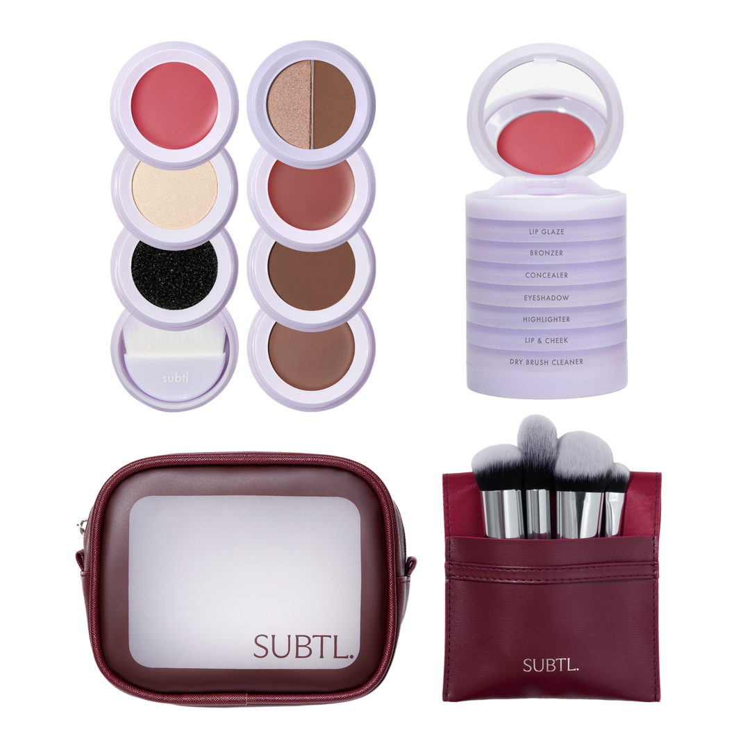 The ultimate all-in-one stackable set for a full face in minutes. Brighten with concealer, add warmth with bronzer, sweep on eyeshadow, and finish with lip, cheek, and highlighter. Kit complete with tools for effortless, everyday beauty.