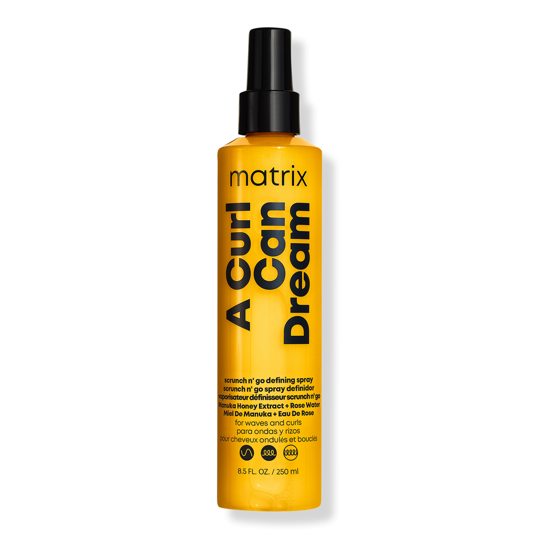 Matrix A Curl Can Dream Scrunch N' Go Defining Spray infused with manuka honey extract and rose water, for waves and curls, defines the hair's pattern without weigh down. This spray is packed with ingredients to achieve all day moisture and shine.
