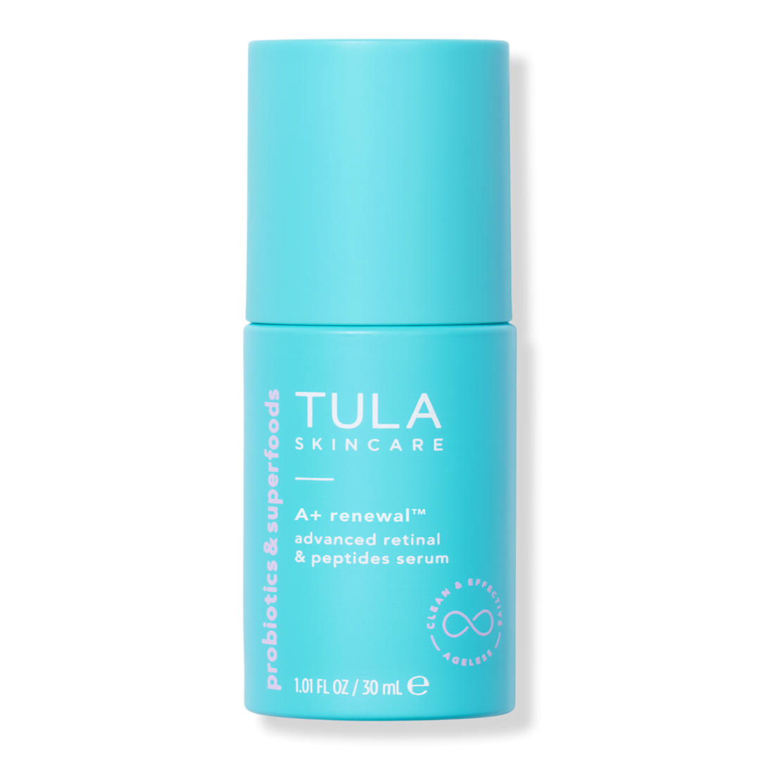 Say goodnight to fine lines & wrinkles with TULA's A+ Renewal Advanced Retinal & Peptides Serum. It combines retinoids with our signature probiotic extracts to deliver an effective yet non-irritating & hydrating formula.