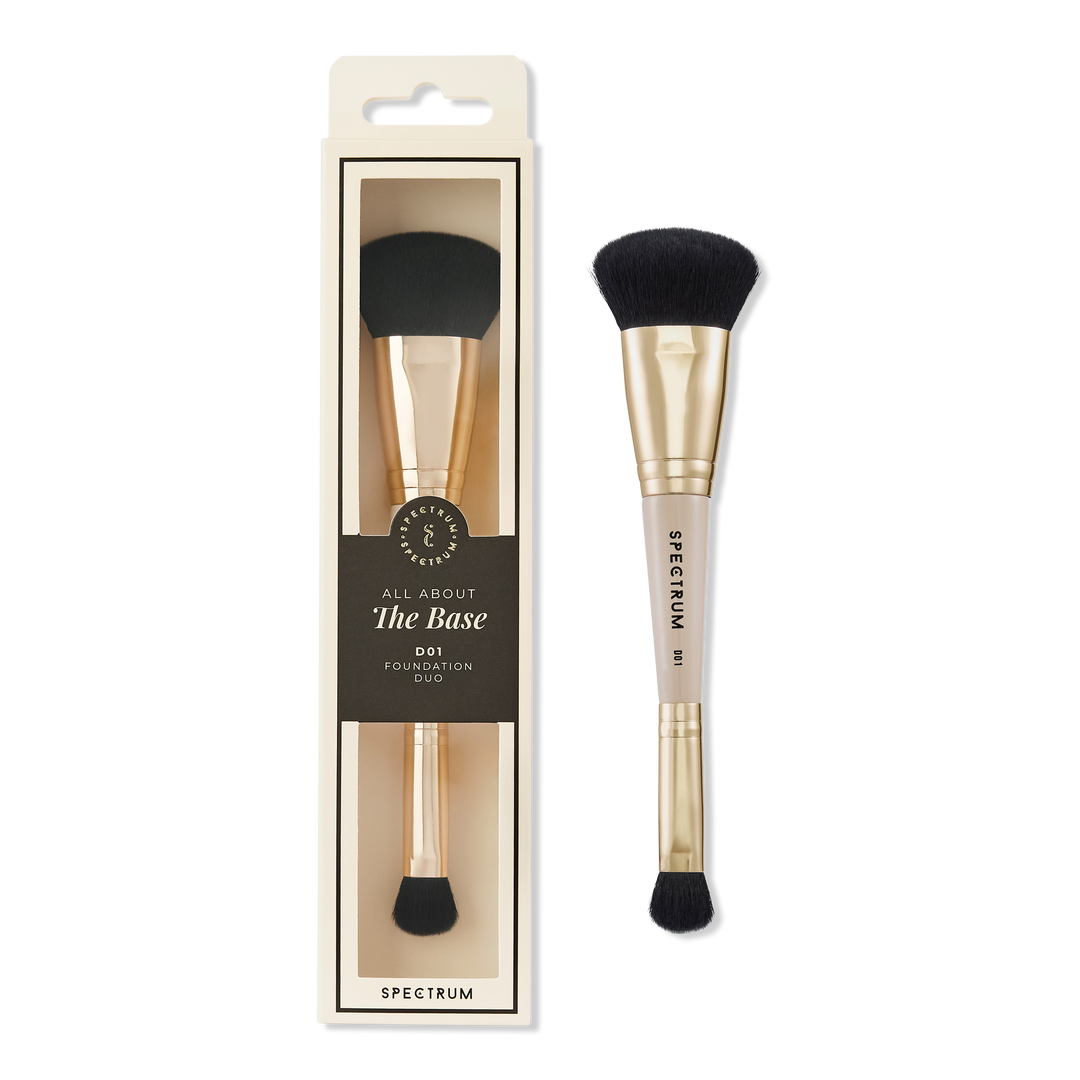 Flawless foundation and concealer is made effortless with Spectrum's All About The Base Foundation Dual-Ended Brush. Apply and blend liquid or cream product with the large foundation brush then take the smaller concealer brush to brighten under eyes.