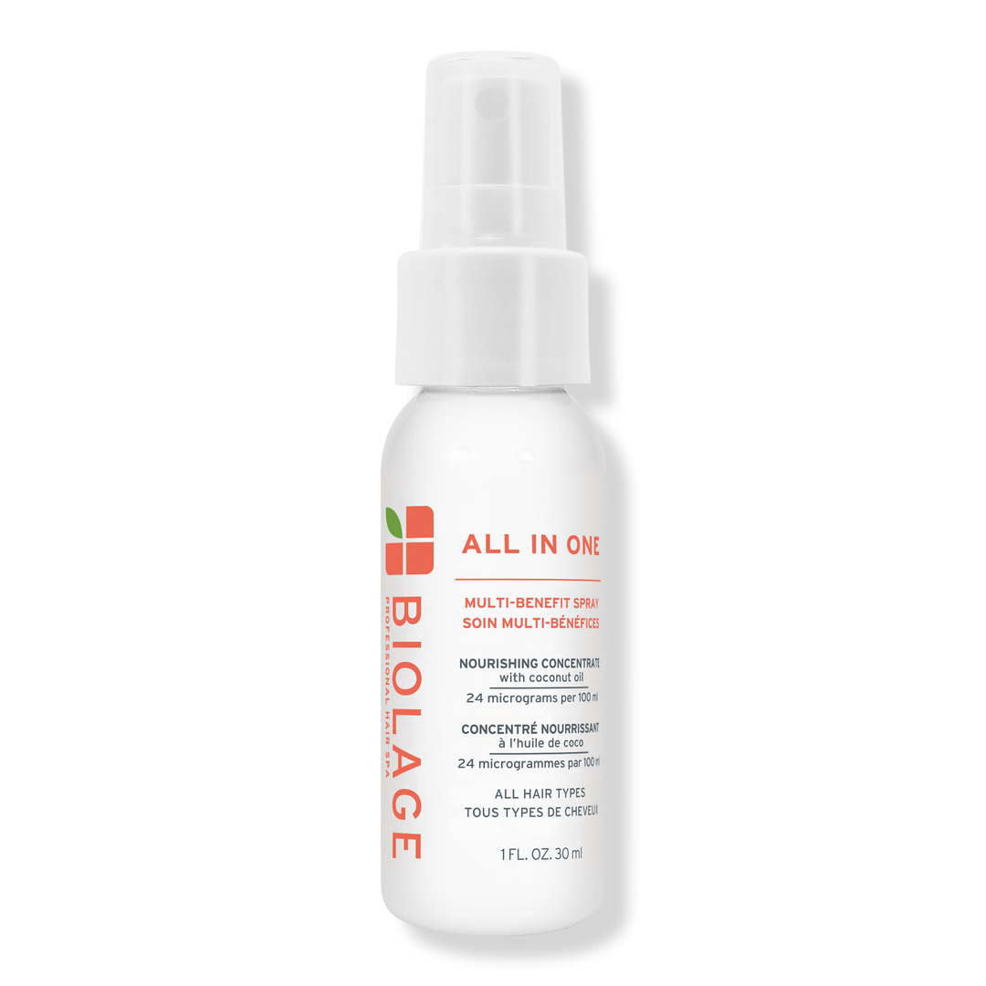 Biolage's All-In-One Multi-Benefit Spray, infused with pressed coconut oil, delivers 20 benefits including frizz control, detangling, heat protection, and a silky touch, for soft, touchable hair. This lightweight leave-in spray offers intense conditioning without weighing hair down.