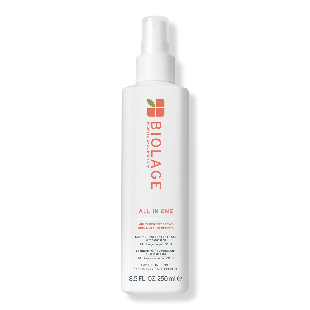 Biolage's All-In-One Multi-Benefit Spray, infused with pressed coconut oil, delivers 20 benefits including frizz control, detangling, heat protection, and a silky touch, for soft, touchable hair. This lightweight leave-in spray offers intense conditioning without weighing hair down.