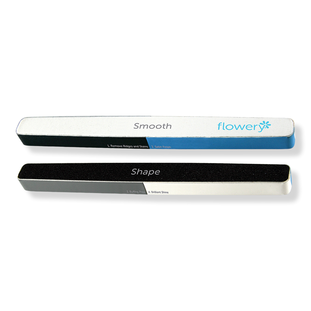 Flowery's All-in-One Nail File combines a shaper, ridge remover, finisher, buffing prep, smoother, and shiner in one easy-to-use buffing file.
