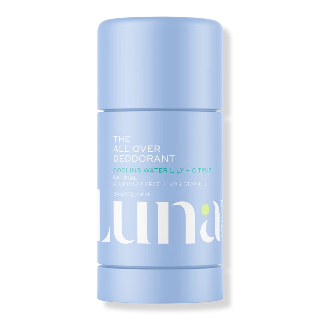 Luna Daily’s The All Over Deodorant is a natural aluminum free + non staining, pH-balanced body deodorant stick. Glides smoothly onto skin for all day odor protection.