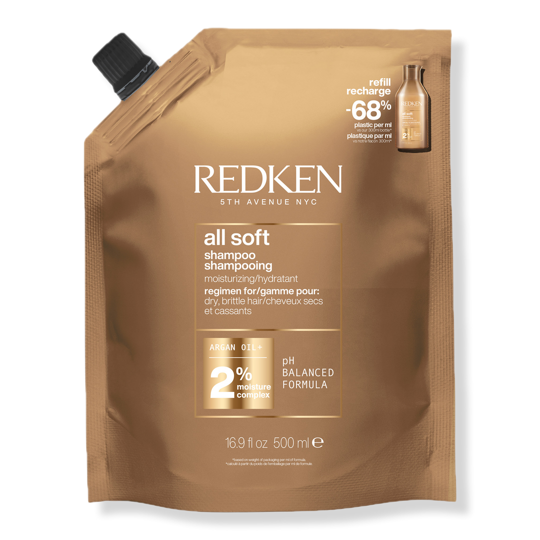 Refill your All Soft Shampoo bottle with Redken's sustainable pouch for an eco-friendly routine. Apply to wet hair, lather, and rinse. Follow with All Soft Conditioner.