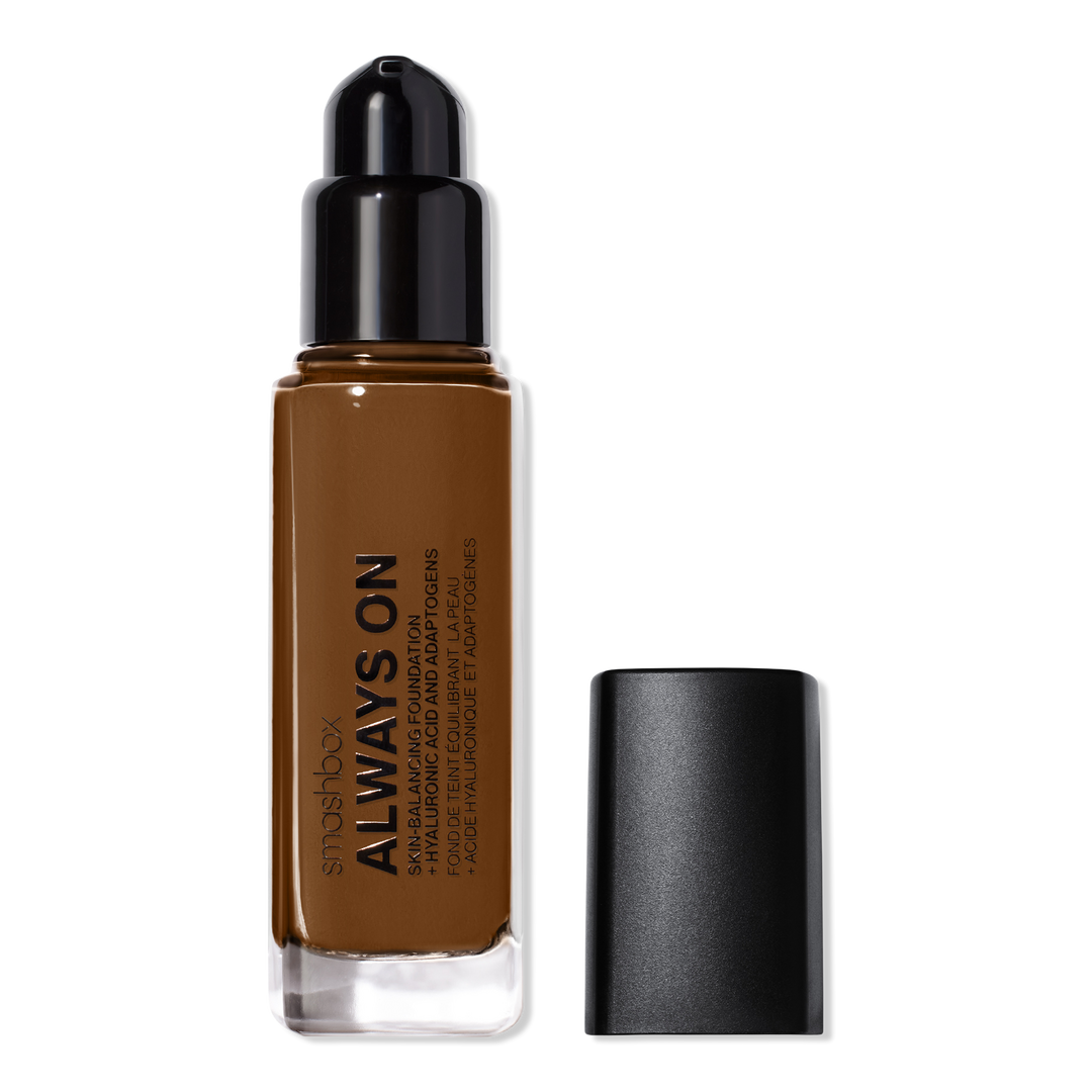 Smashbox's Always On Skin-Balancing Foundation with Hyaluronic Acid + Adaptogens is their innovative longwearing foundation with skin-balancing oil control & hydration that supports skin instantly & over time, buildable coverage for a visibly even, natural look, & 16-hour, color-true wear.