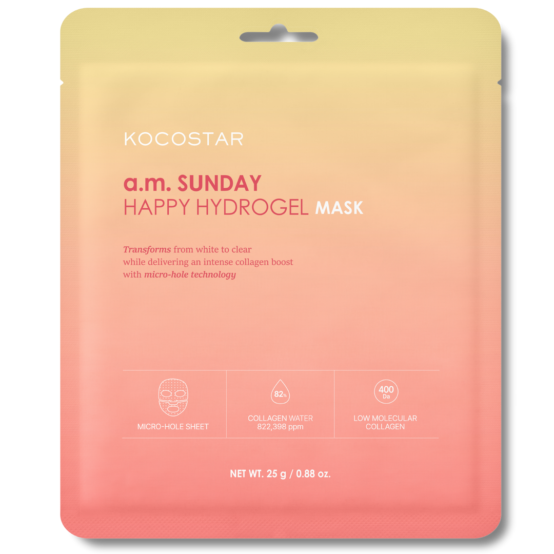 Kocostar's a.m. Sunday Happy Hydrogel Mask is made with 400 Da Norwegian collagen water to promote skin elasticity and deliver intense hydration.