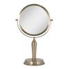8.75-inch width by 5-inch depth by 14-inch tall. 7-inch diameter round reflective mirror surface. 360-degree swivel not lighted makeup mirror. Dual sided 5-times and 1-times magnified makeup mirror without light. Non-slip base.