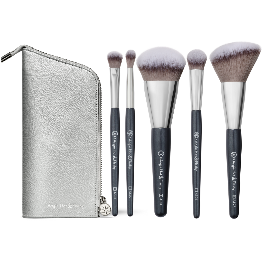 Five travel-sized Angie brushes with a zip-down vegan leather pouch that converts to a standup brush cup. Includes foundation, concealer, angled blush, lid and crease shaders.