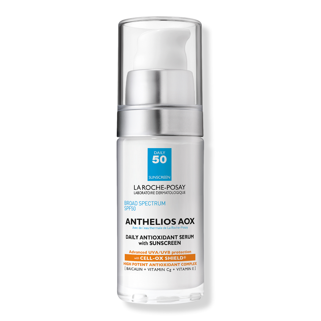 La Roche-Posay Anthelios AOX Daily Antioxidant Face Serum SPF 50 with broad-spectrum sunscreen improves the look of fine lines, dark spots and skin texture.