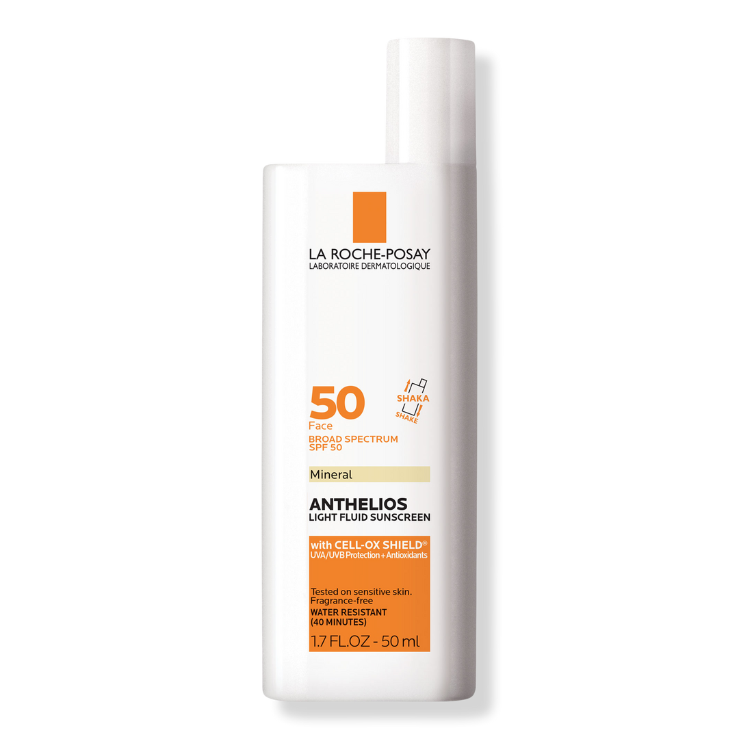 The La Roche-Posay Anthelios Mineral Ultra-Light Sunscreen Fluid SPF 50 with zinc oxide and titanium dioxide offers oil-free, 100% mineral sunscreen protection.