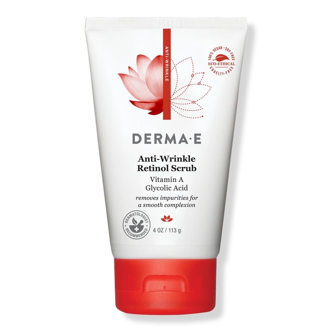 Derma E's Anti-Wrinkle Retinol Scrub with Glycolic Acid deep cleans to remove impurities and reveal a radiant, smooth complexion and a refreshed, healthy glow.