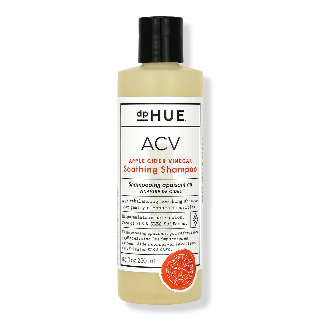 The dpHUE Apple Cider Vinegar Soothing Shampoo gently cleanses hair, rebalances scalp pH and keeps hair color vibrant. This SLS and SLES sulfate-free shampoo is infused with amino acids, panthenol, lavender, ginseng and ginger extracts. For all hair colors and types.