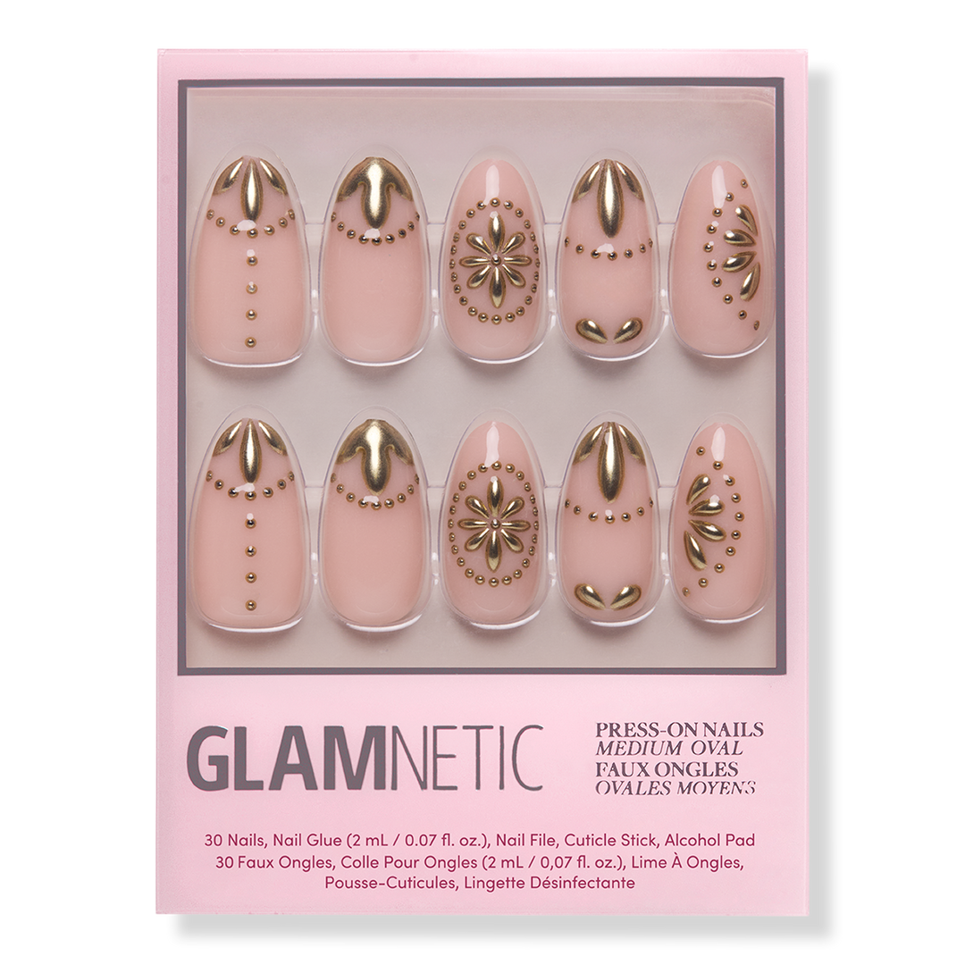 Channel your inner Greek goddess. Glamnetic's Athenian Gold Press-On Nail Set pays tribute to ancient Greece with raised gold foil patterns that echo classical architecture. Finished with a high-shine gloss in an elongating medium oval shape, this salon-quality mani impresses for up to 2 weeks.