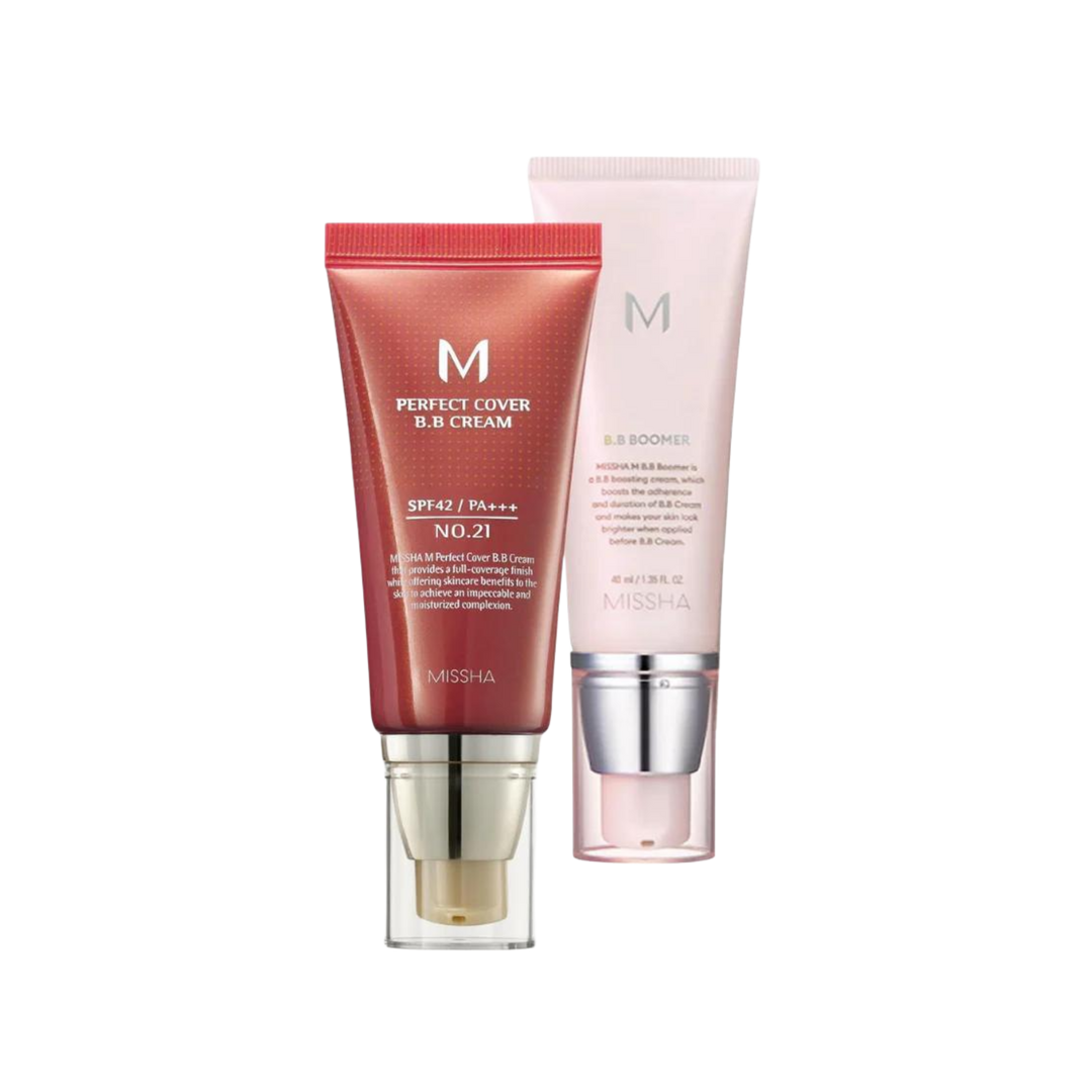 The MISSHA BB Essential Kit combines the M Perfect Cover BB Cream and M BB Boomer for flawless, long-lasting skin.