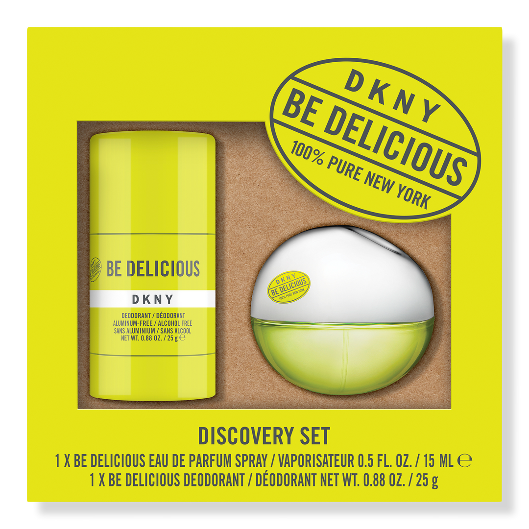 Discover the playful world of DKNY Be Delicious with a 15ml Eau de Parfum & 25g aluminum-free deodorant set.
