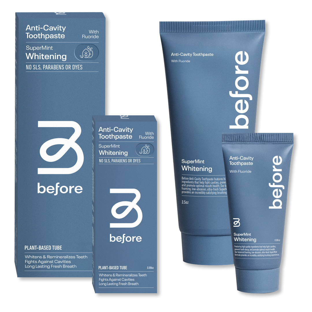 - Includes one 3.5oz and one 0.67oz Before Anti-Cavity SuperMint Whitening Toothpaste.