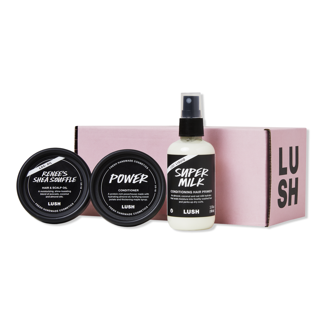 Best For Curls And Coils Haircare Discovery Kit is a trio of Lush's bestselling hair products for textured hair, including a protein-packed conditioner; a rich hair and scalp oil; and the viral sensation, Super Milk.