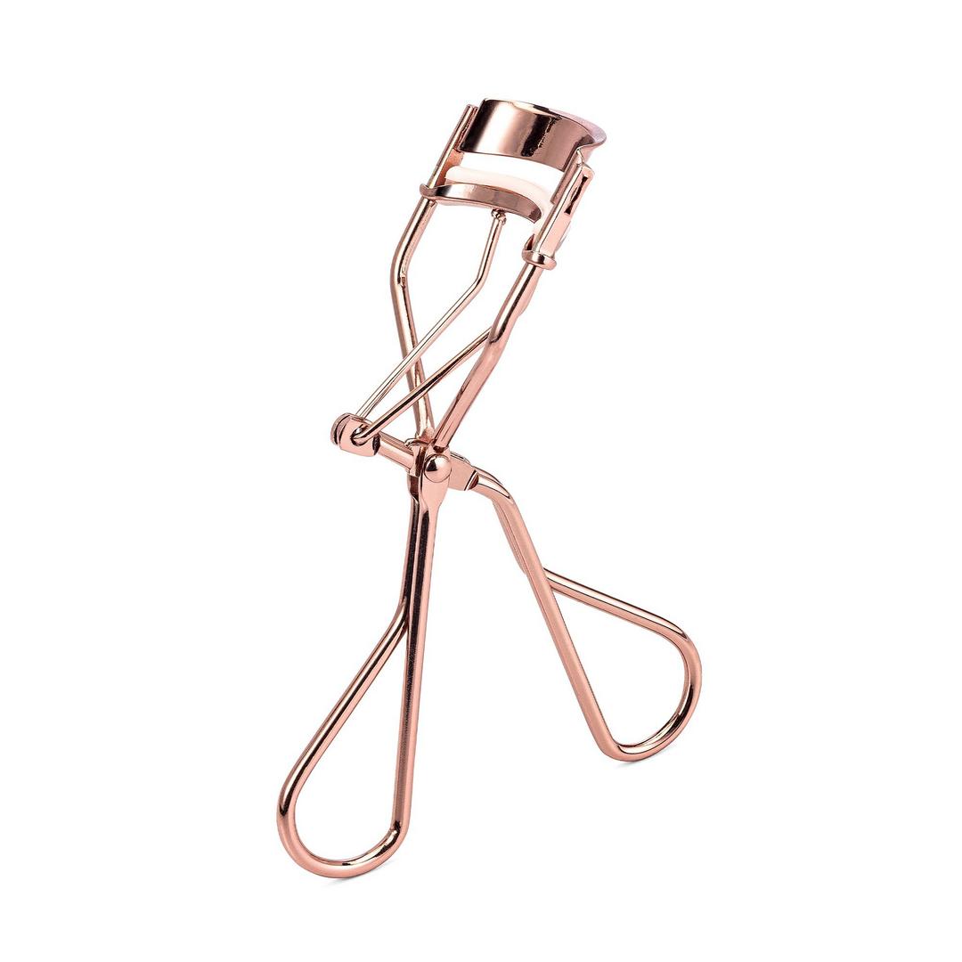A custom eyelash curler designed for hooded and deep-set eyes, with a flatter curve and upright angle to limit pinching and lift lashes into an open, elongated swoosh. Finished in dark rose gold with a pink pad. Includes four extra silicone pads.