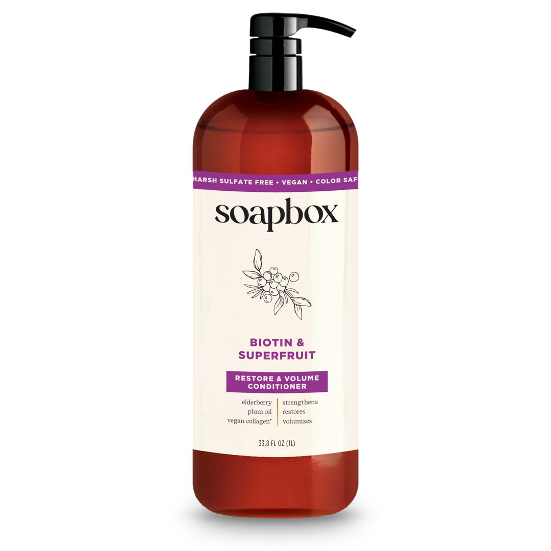 - Crave fullness, ditch fallout! This rich conditioner is packed with biotin to support fullness, volume-promoting vegan collagen*, and superfruits elderberry and plum oil to help give your hair a stronger and restored look to go from weak, limp hair to fuller, envy-worthy tresses. We've also supercharged this conditioner with a custom 5X vitamin complex for healthier hair made easy. This color-safe, volumizing conditioner is formulated for all hair types for both men and women, and is silicone-free, paraben-free, gluten-free, and vegan. For every Soapbox item sold, a bar of soap is donated to someone in need.