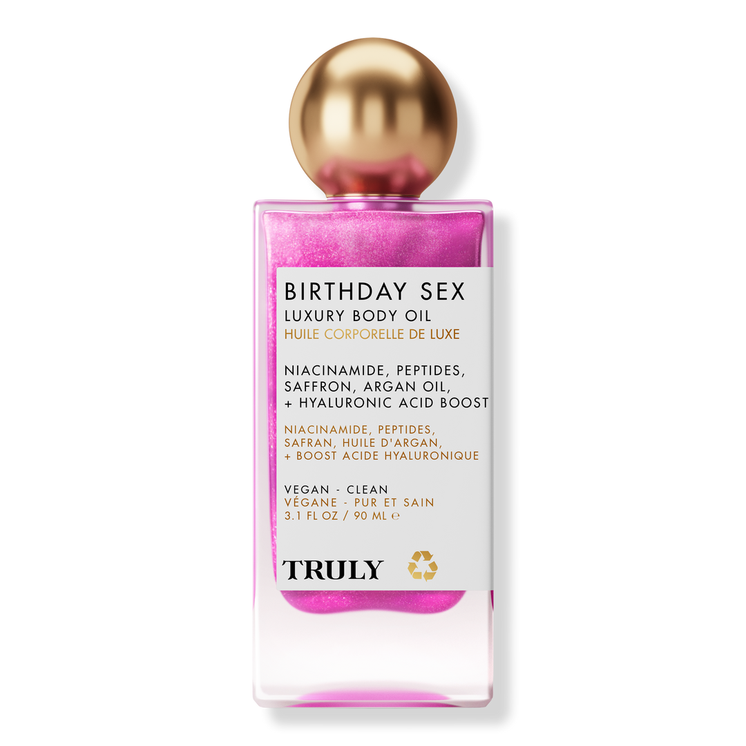 Truly’s Birthday Sex Luxury Body Oil visibly tightens and hydrates skin for shimmering summer radiance with a premium blend of peptides and hyaluronic acid.