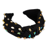 The Black Knotted Gem Headband by Locks & Mane is a wide black fabric headband lavishly adorned with an array of multi-colored jewels. The contrast between the black fabric and sparkling jewels makes this headband a standout accessory, perfect for elevating any outfit.