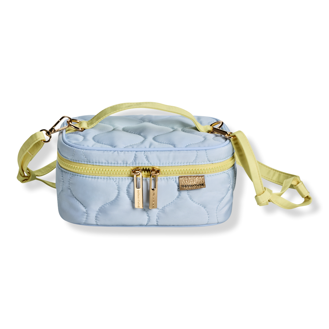 Make a stylish statement and carry travel essentials with the Tartan + Twine Blue Mini Train Case with Strap.