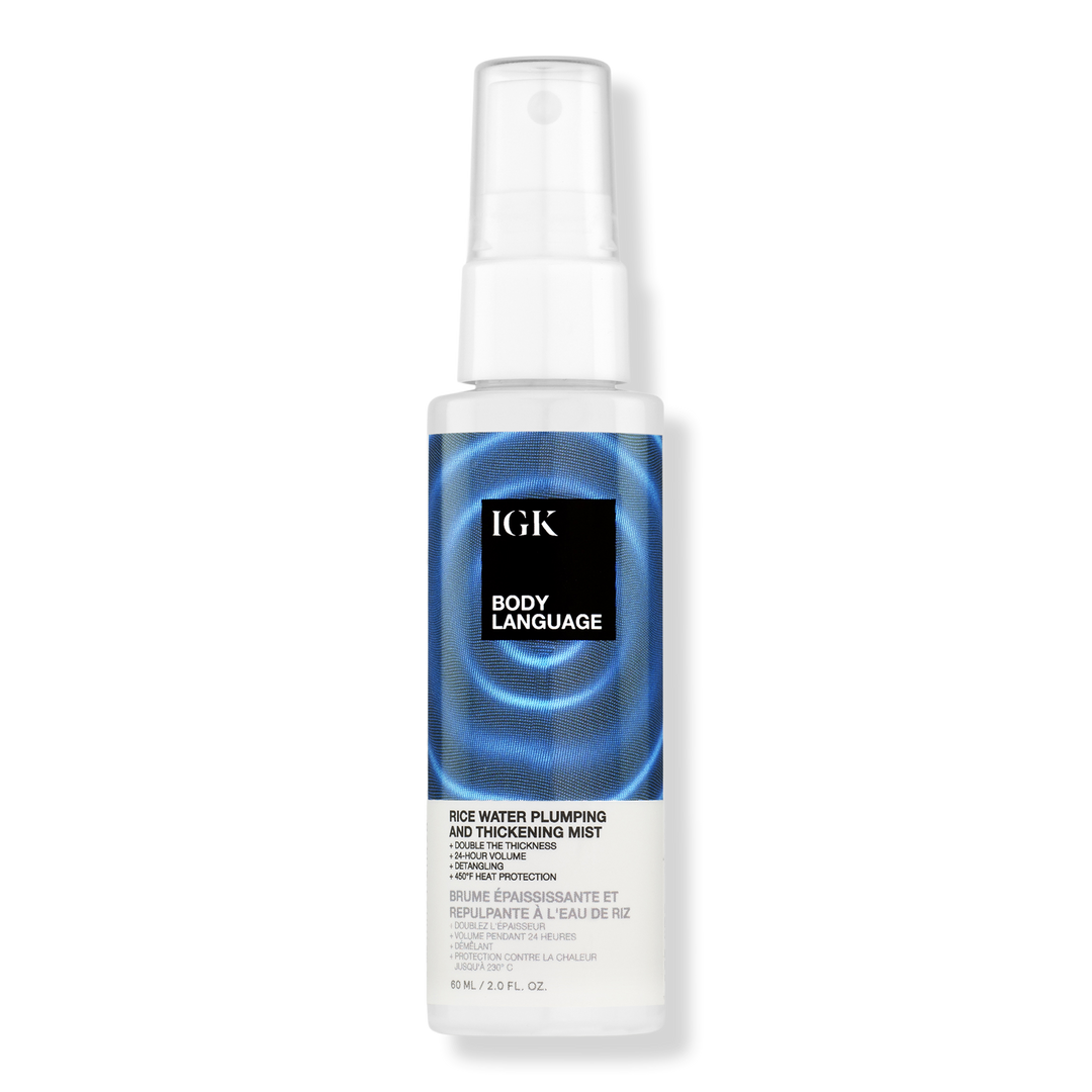 IGK Body Language Rice Water Plumping and Thickening Mist. A heat-activated, prep mist that provides 24-hour volume and double the thickness. Weightless rice water essence detangles, hydrates, and provides 450°F heat protection to prime and plump fine, thin strands.