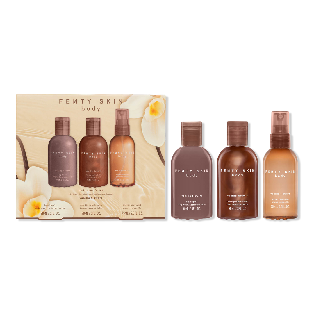Get to know the new feel of body care in Rihanna's favorite scent: Vanilla Flowers, a warm, sultry and rich floral gourmand. This Body Start'r Set Mini Body Trio by Fenty Skin body includes a travel-size body wash, bubble bath and body mist.