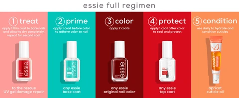 For the perfect manicure, apply one coat of any of Essie base coats on nails. Follow with two coats of Essie original nail color. Finish with any one of Essie's top coats.