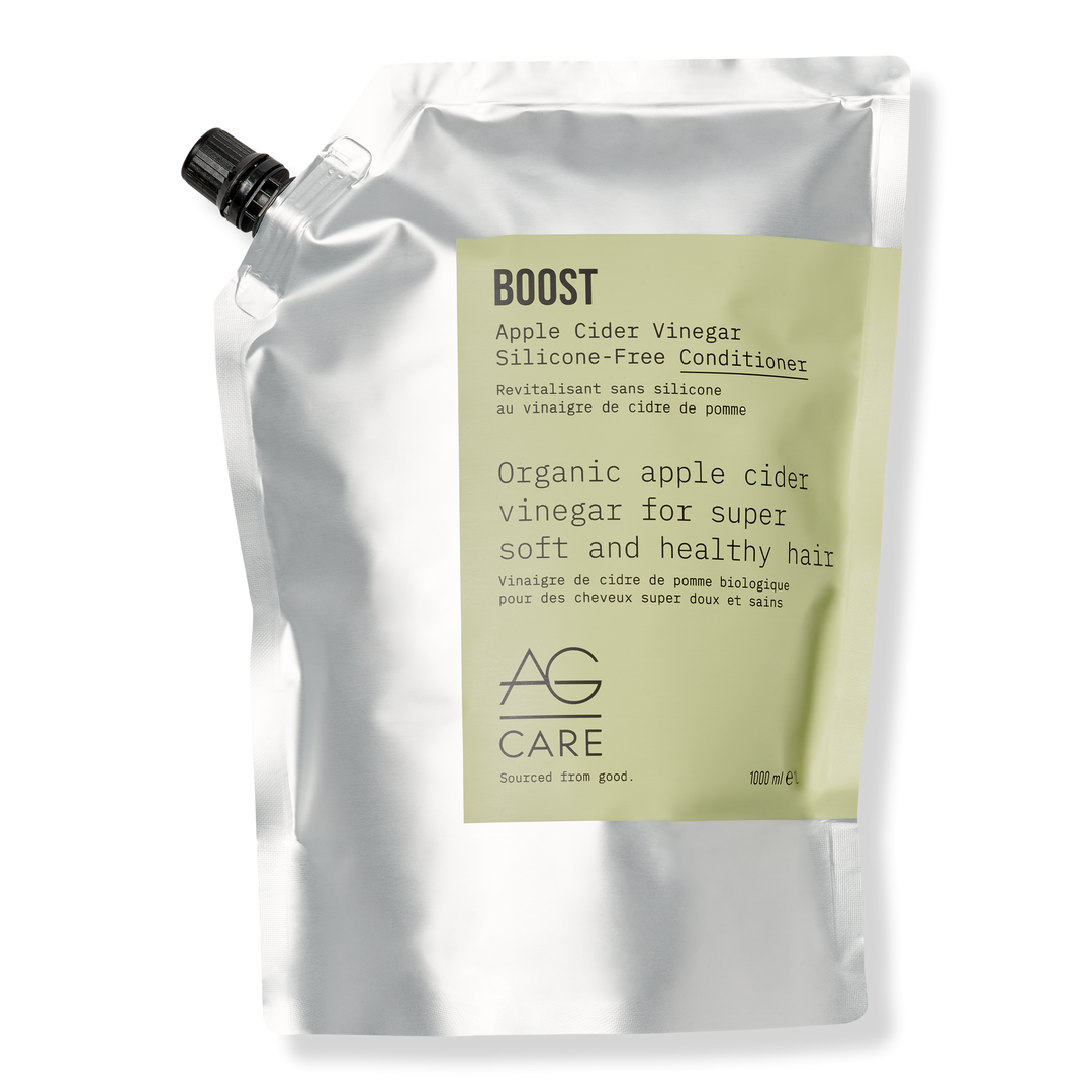 Condition and smooth cuticles while sealing in moisture with mango seed butter, apple cider vinegar and an abundance of nourishing superfoods in this 98% Plant-Based Essentials Boost Apple Cider Vinegar Silicone-Free Conditioner by AG Care.