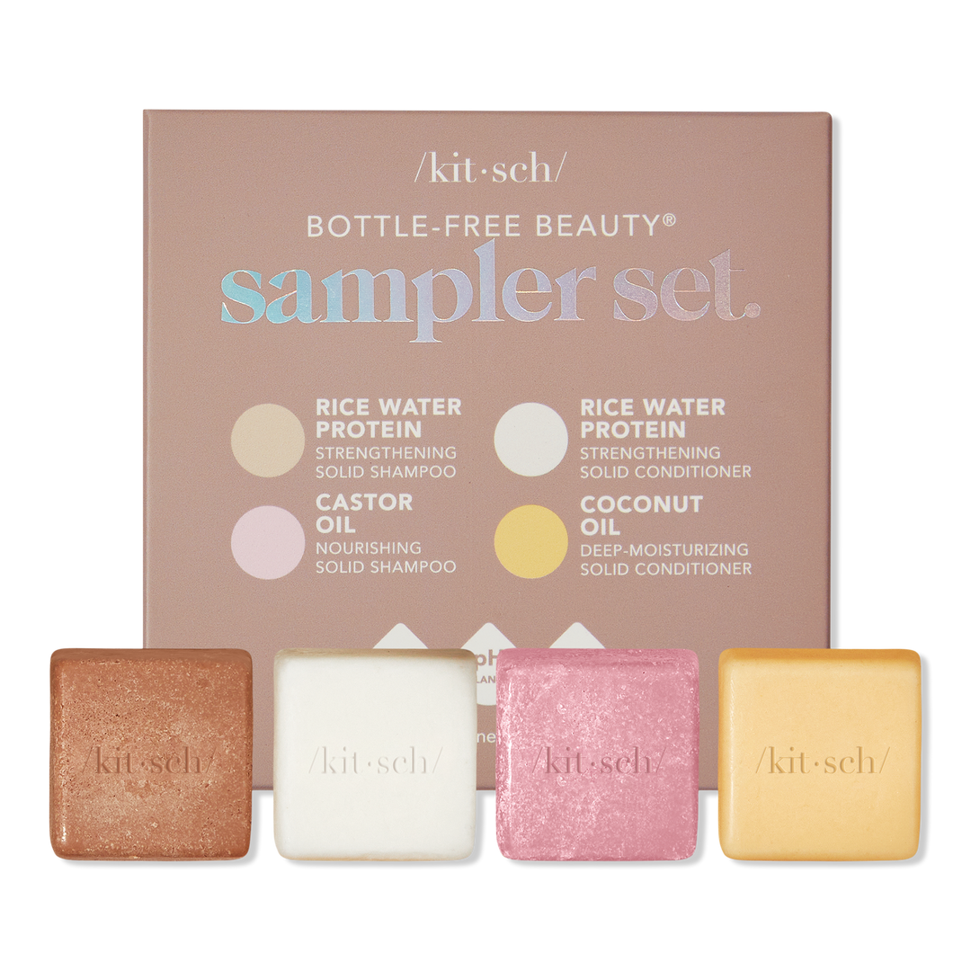 Kitsch Bottle-Free Beauty 4pc Sampler Set. Formulated with rice water to help repair damaged hair follicles & prevent split ends Rice Protein has been shown to increase hair volume by 20% after 5 washes.*