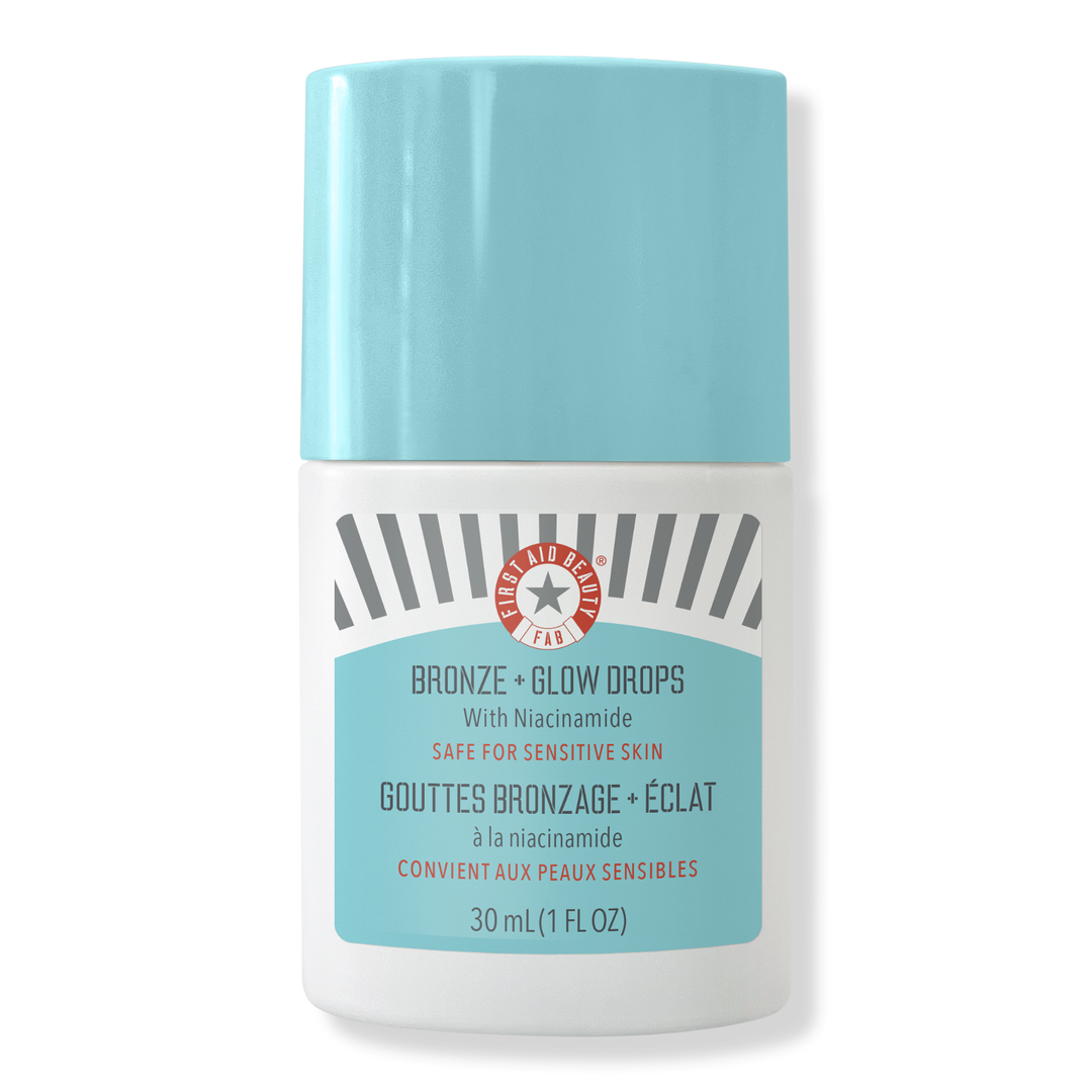 First Aid Beauty's Bronze + Glow Drops with Niacinamide give an instant glow with a bronze kiss of color to visibly even skin tone, blur pores and hydrate.