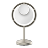 The Conair Brushed Satin Nickel Lighted Fan Mirror offers lifetime LED lighting with 3 adjustable settings and integrated fan technology to cool you down. With 1x and 10x magnification, tilting hinge, and a 6.3" viewing area, it’s your perfect beauty companion.