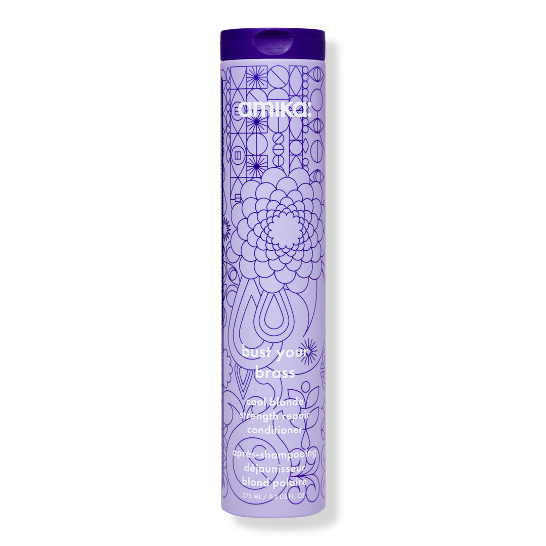Condition and tone brassy hues while hydrating and strengthening strands with amika's Bust Your Brass Cool Blonde Strength Repair Conditioner.