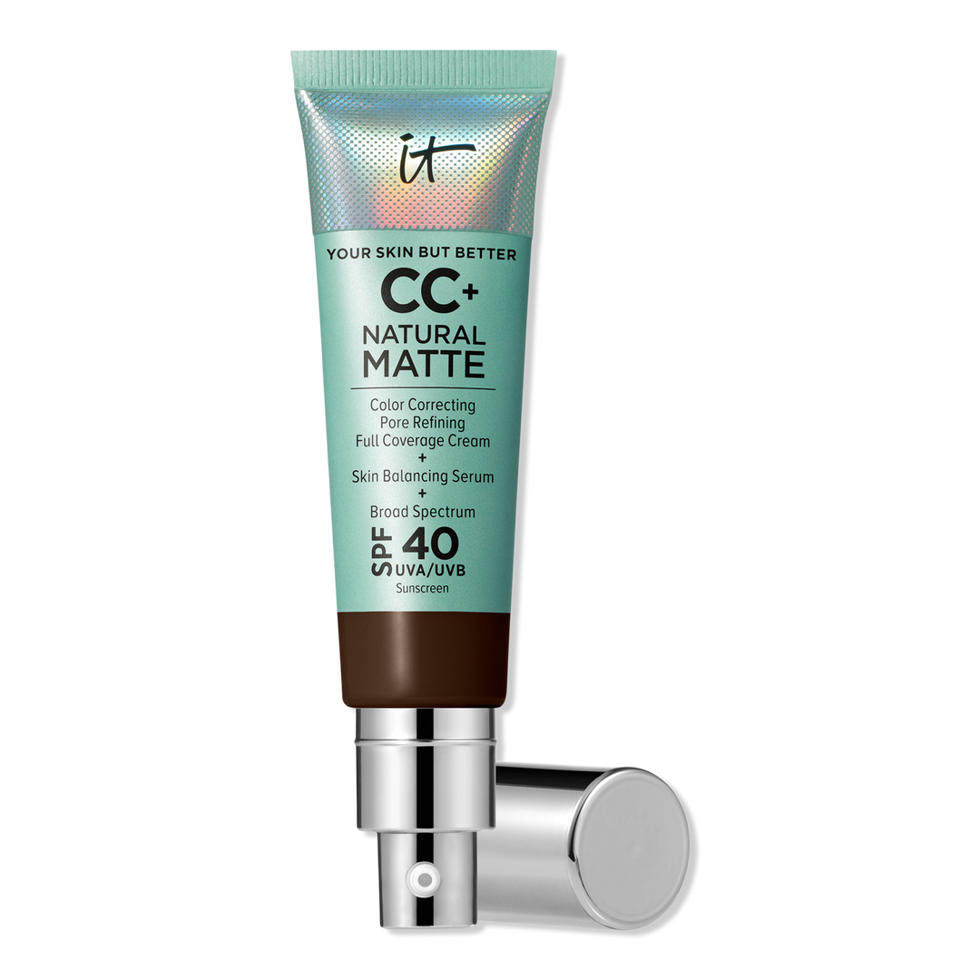 IT Cosmetics CC+ Natural Matte with SPF 40: A mattifying, full-coverage foundation, serum, and SPF 40 sunscreen for oily/combination skin. Clinically proven to reduce shine, improve texture, and boost overall skin quality in 8 weeks.