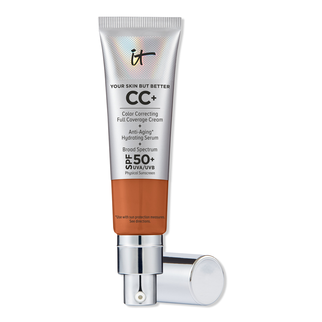 IT Cosmetics CC+ Cream with SPF 50+ goes beyond color-correcting to include your full coverage foundation, anti-aging serum and broad-spectrum sunscreen in one.