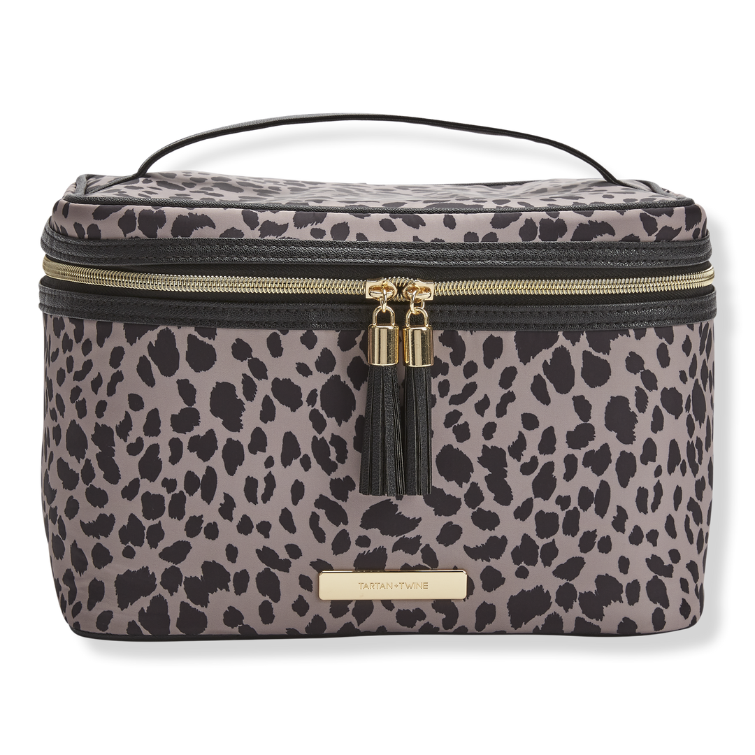 The Tartan + Twine Cheetah Charm Deluxe Train Case with polyester cheetah print keeps you organized, on-trend, and on-the-go! With brush slots and pocket for smaller items.