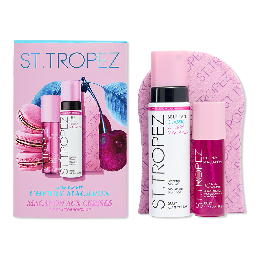 Cherry Macaron Self Tan and Body Mist Set features St. Tropez Classic Bronzing Mousse in a Cherry Macaron fragrance, limited edition pink mitt and hair & body mist featuring notes of sweet cherry, white florals & warm vanilla.